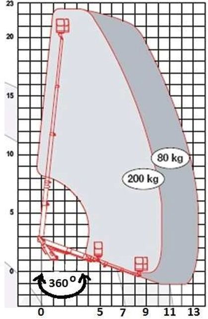 #194. W oparciu o przedstawiony wykres pola pracy wskaż maksymalny wysięg platformy roboczej obciążonej masą 200 kg uniesionej na wysokość 22 m: