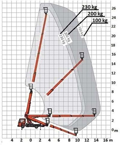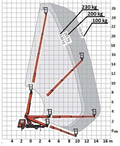 #195. W oparciu o przedstawiony wykres pola pracy wskaż maksymalny wysięg platformy roboczej obciążonej masą 230 kg uniesionej na wysokość 17 m: