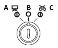 #87. Załączenie mechanizmu podnoszenia podestu nożycowego realizowane jest poprzez wychylenie dźwigni sterującej po wcześniejszym wciśnięciu przycisku oznaczonego literą: