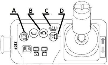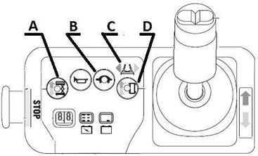 #86. Załączenie mechanizmu jazdy podestu nożycowego realizowane jest poprzez wychylenie dźwigni sterującej po wcześniejszym wciśnięciu przycisku oznaczonego literą:
