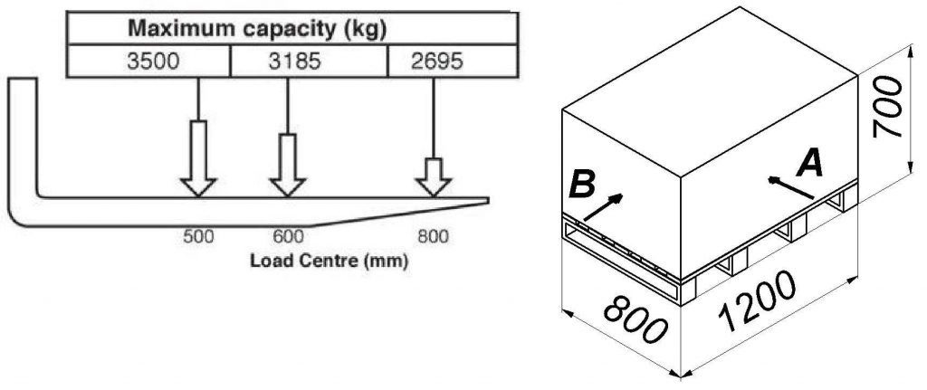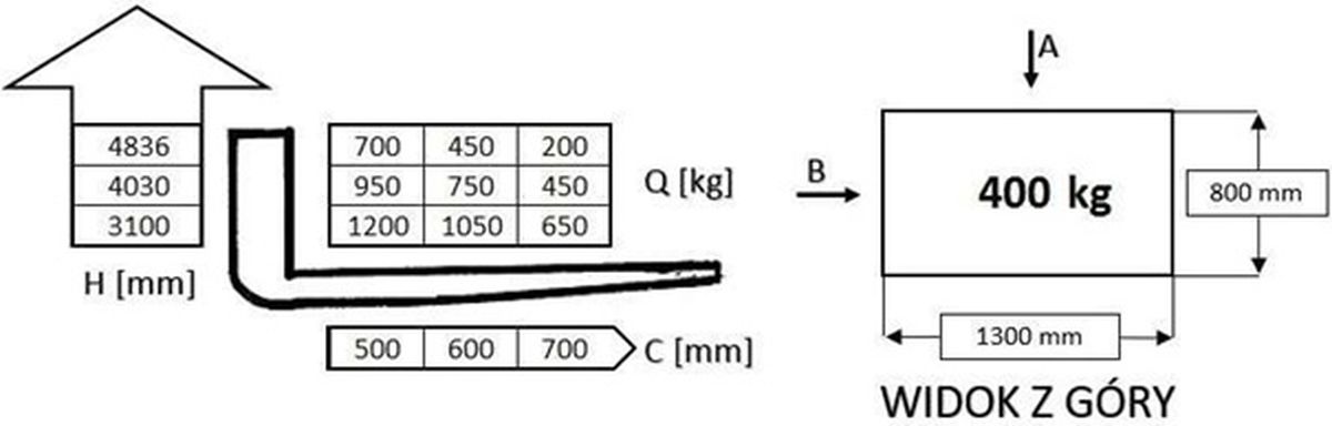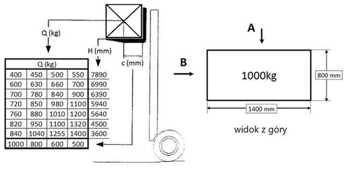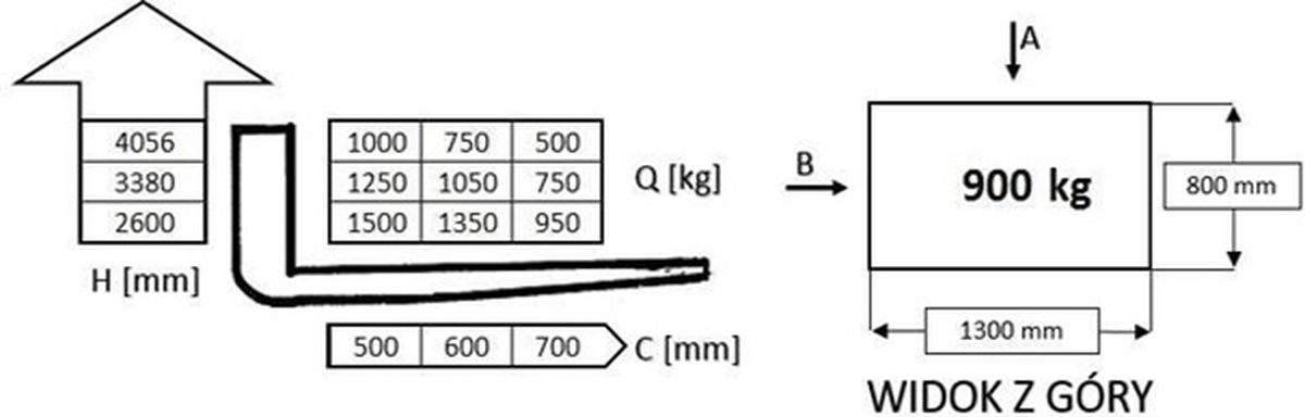 #237. W oparciu o przedstawiony diagram udźwigu oraz rysunek określ maksymalną masę ładunku jaką można bezpiecznie podnieść na wysokość 4000 mm, pobierając od strony B: