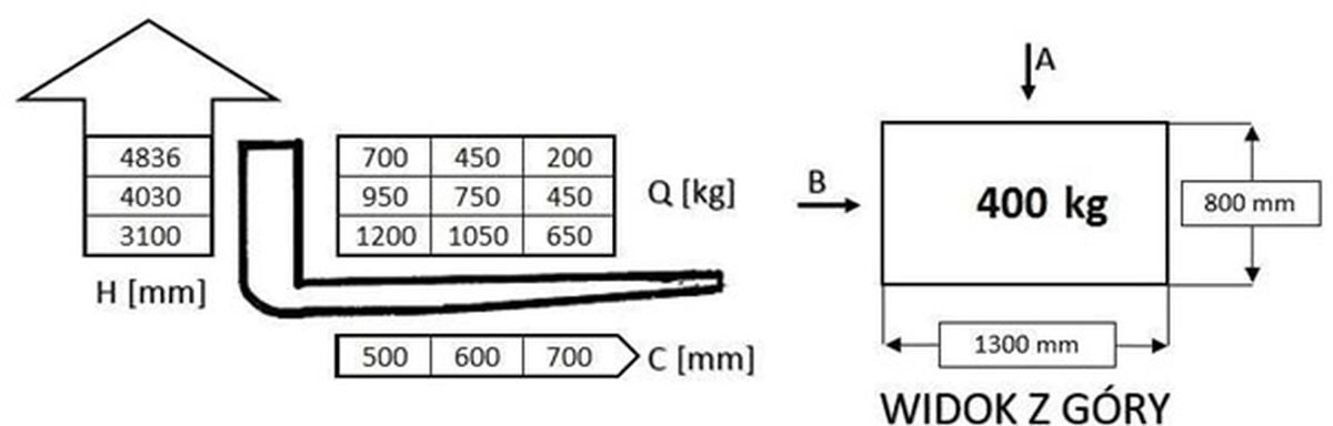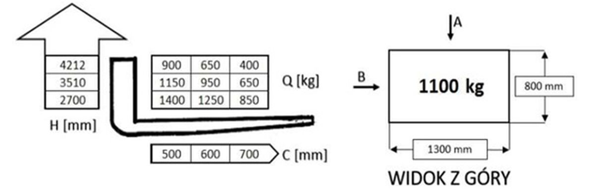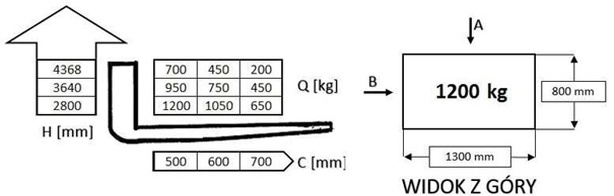 #210. W oparciu o przedstawiony diagram udźwigu i rysunek określ maksymalną bezpieczną wysokość podnoszenia ładunku pobranego od strony B:
