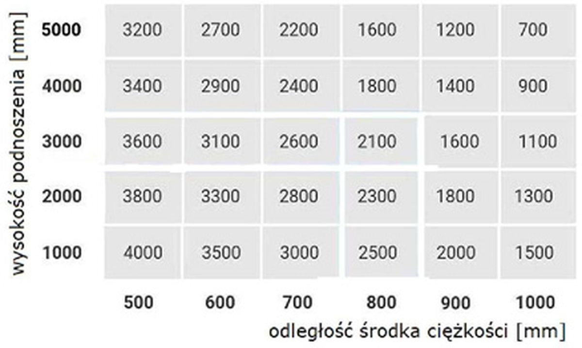 #235. W oparciu o przedstawiony diagram udźwigu określ maksymalny udźwig wózka, podnoszącego ładunek na wysokość 4000 mm:
