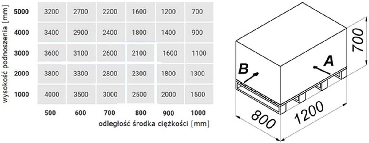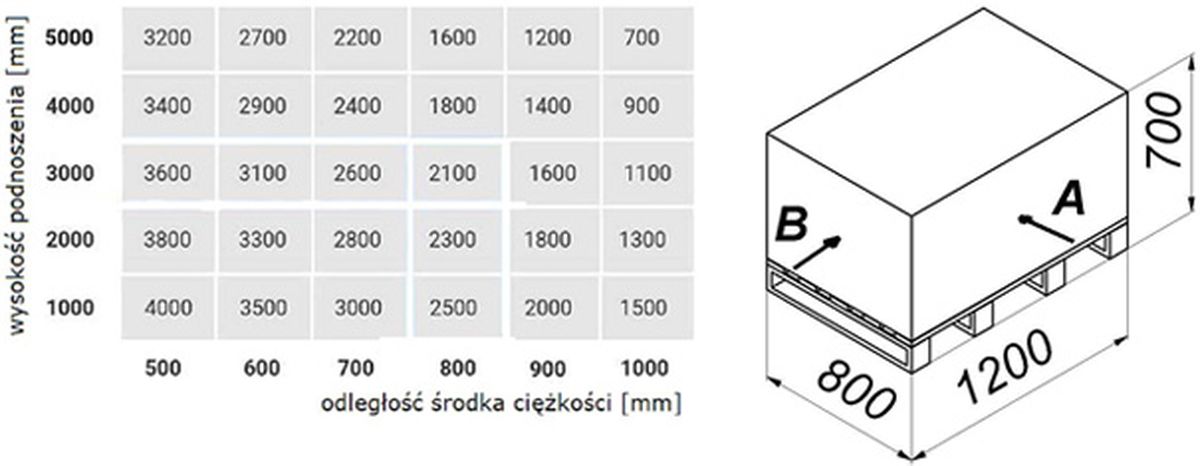 #238. W oparciu o przedstawiony diagram udźwigu oraz rysunek określ maksymalną masę ładunku jaką można bezpiecznie podnieść na wysokość 4000 mm, pobierając od strony A: